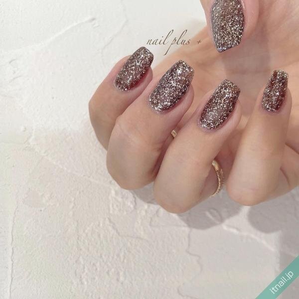 ダークなブラウンをベースに、グリッターの敷き詰めネイルを重ねれば、華やかだけど落ち着いた大人ネイルになります。かっこよさを出したいときは、爪の形をスクエアオフにするのもおすすめです。