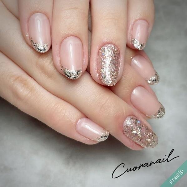 敷き詰めグリッターとフレンチデザインのキレイめネイル