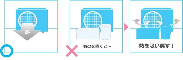 室外機の吹き出し口周辺がモノやカバーによって塞がれていると、その熱がうまく外へ排出されません。
