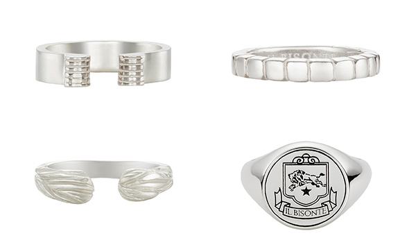 リング類は、古代ギリシャの建設様式から着想を得た、左右対称の渦巻きモチーフが特徴の「VOLUTA DI STILE CORINZIO」(税込2万4200円)や、ブランドのロゴが入った「EMBLEM DI IL BISONTE」(税込2万4200円)など、全7型が展開されています。