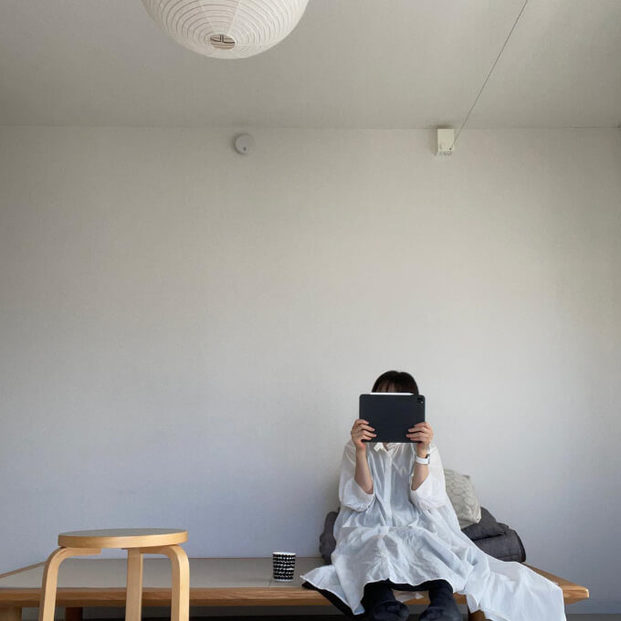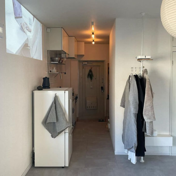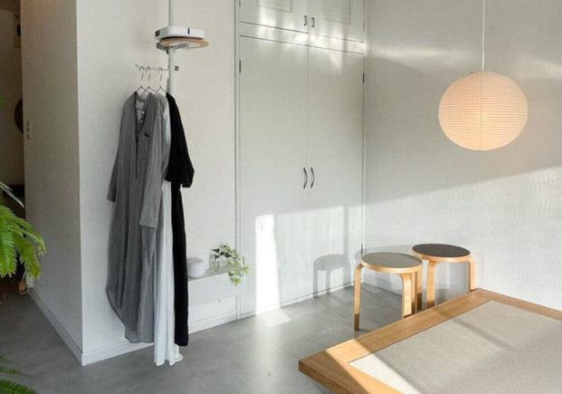災害によって家にある多くのものが壊れてしまったことをきっかけに、ミニマリスト的な暮らし方へ移行したというapartment301さん。彼女が一人暮らしをしているのは25平米のワンルームです。部屋にある家具といえば、ベッドとスツールが2個、そしてシンプルなコートハンガーのみ。