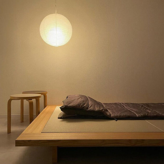 お部屋に入ってまず最初に目がいくのがこちらのベッド。木製フレームに畳をはめ込んだタイプで、YouTuber「建築家二人暮らし」さんがデザインを手がけたものだそう。クラウドファンディングで手に入れたのだとか。