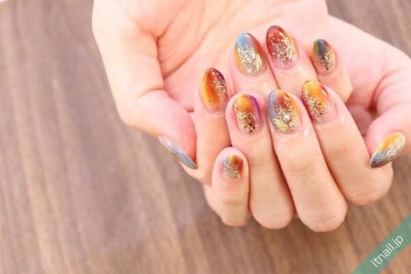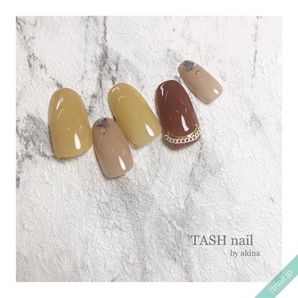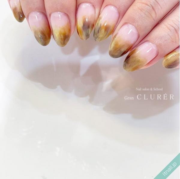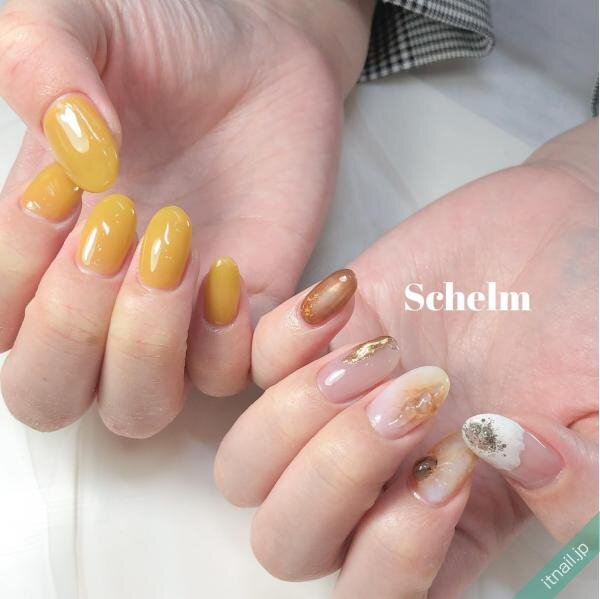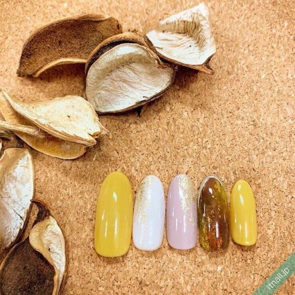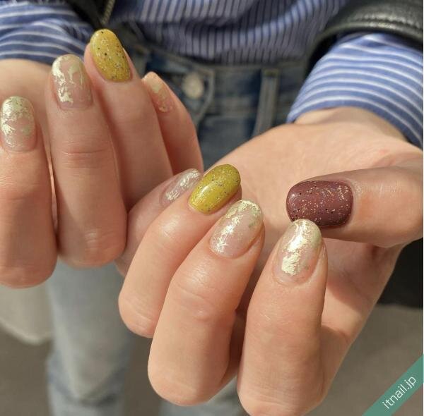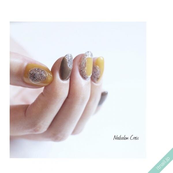 イエローやブラウンネイル自体をざらざらさせるのではなく、斜めに入れたりフレームの中で砂ジェルネイルを入れたりして、ニュアンス感のあるネイルにするのもおしゃれ!カジュアルで個性的な指先が楽しめます。