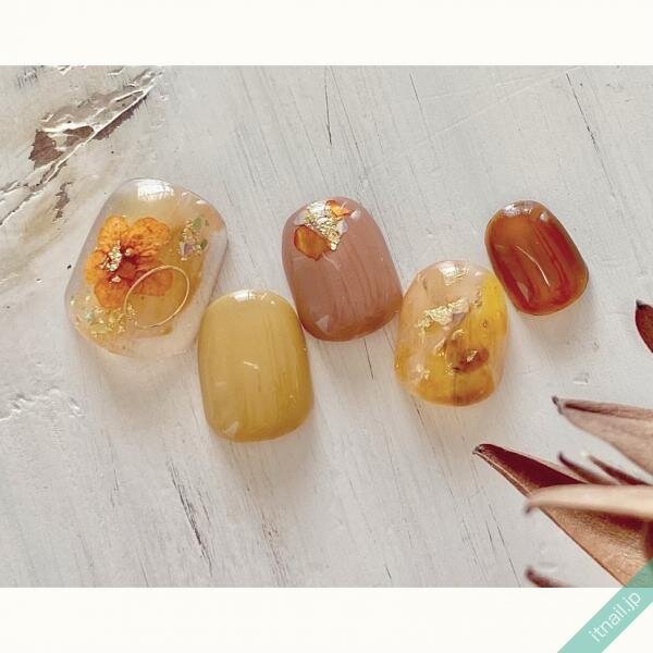 向日葵カラーのネイルに、押し花を添えて大人可愛いネイルにするのも人気です。押し花も、ブラウンやオレンジっぽい色を意識するのがおすすめ!シェルの輝きが夏らしさをしっかり残してくれます。