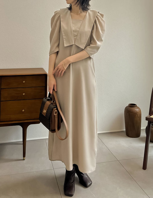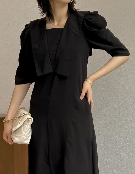 一枚でぐっと華やぐ、セーラーカラーデザインのワンピース。ふんわりとしたスリーブデザインがレディな表情も叶える一着です。