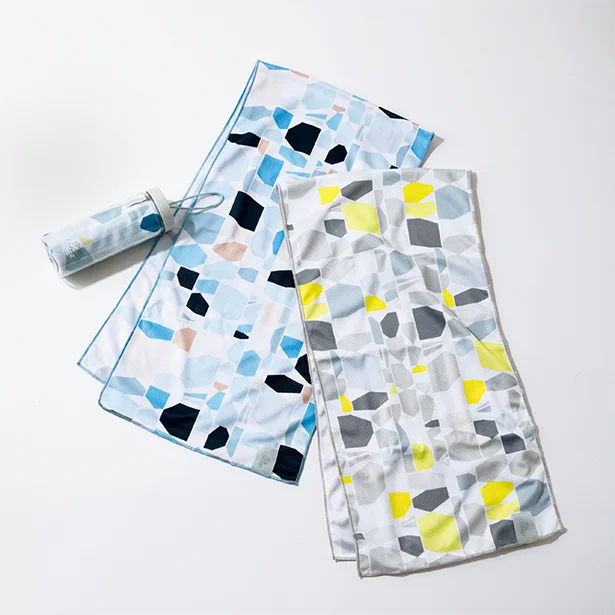 水にぬらして絞り、パタパタと振って風に当てることで、ひんやりと冷たくなるポリエステル素材のタオル。