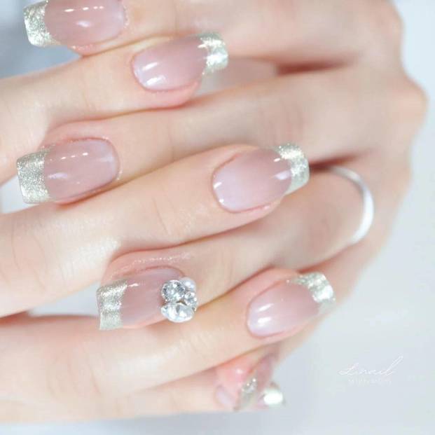 オールシーズン使えるスモーキーピンクには、シルバーラメのフレンチをプラスして8月らしさをプラスしましょう!