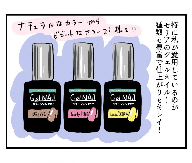 どの色もキレイに仕上がるのはジェルネイルならでは。みなさんもお気に入りのカラーを見つけてみてくださいね!1つ110円という破格の安さなので、ちょっと冒険してみるのも楽しいかもしれません。