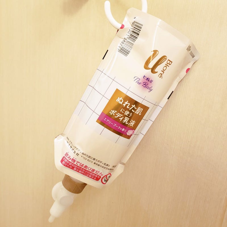 こちらは、入浴後のぬれたお肌にそのまま使うボディミルクです。入浴後のお肌は乾燥が進みやすく、とてもデリケート。そのため、乾燥する前に保湿ケアをすることが大切なのですが、お風呂上がりはついついスキンケアの方に気を取られがちではないですか?気付いたら、ボディケアをし忘れちゃった!なんてこともしばしば。このボディミルクなら浴室内につりさげて立ったまま使えるので、ついつい手を抜きがちなボディケアを、簡単に毎日の習慣にできちゃいます。