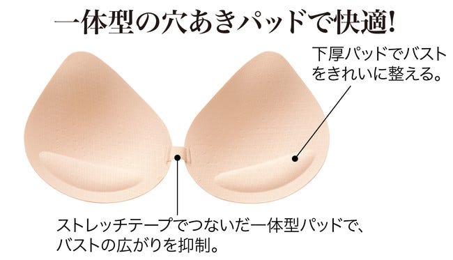 一体型の下厚パッドなので、バストの位置が安定し、広がりもおさえてやさしくバストを持ち上げます。