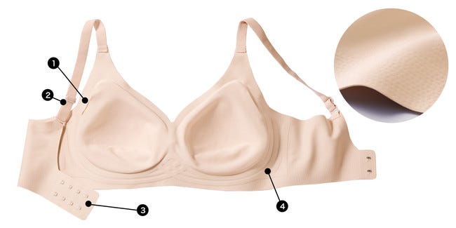 (1)パッドはここからIN。(2)ストラップは調節可能。(3)4列ホックは、ゴロつきの少ないフラットな作り。(4)ワイヤーがなくてもアンダーと脇の伸びをおさえる仕様で安定感を向上。