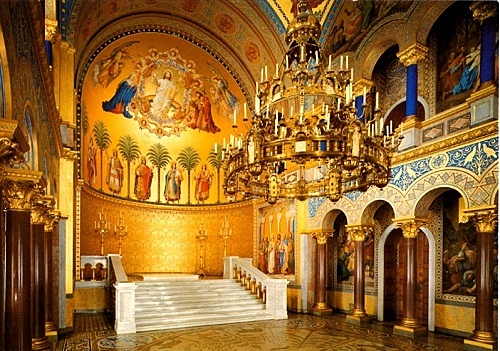 ビザンチン様式の応接ホールです。カララ大理石の階段は後陣へかけられ、