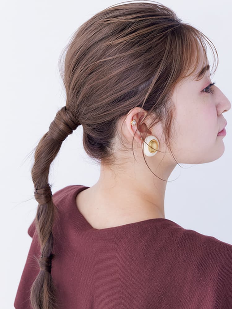 ひとつ結びしたら、結び目から3㎝下あたりを細いゴムで結んでくるりんぱする。毛先は左右にさいてキュッと締める。ロングは2段作る。