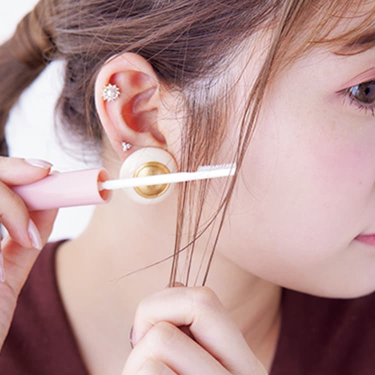 コームタイプのスティックで顔まわりのおくれ毛を引き出して整える。顔の面積を小さく埋めるように引き出すのがポイント。