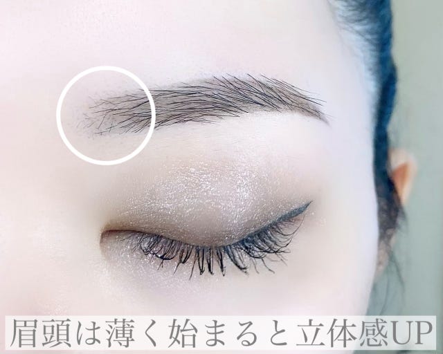 眉頭は皮膚が透けるくらい薄く、眉尻にかけて濃くなるグラデーションを作りましょう。