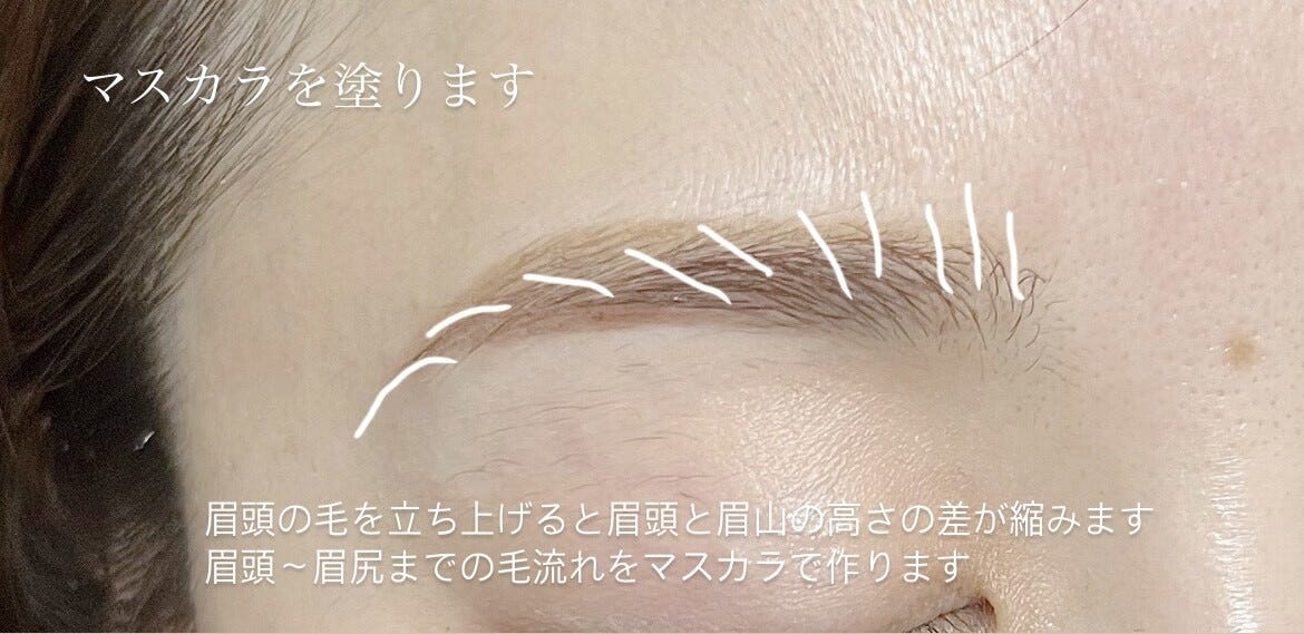 マスカラを塗る時に、眉頭をフワッと立ち上げると眉毛の長さで高さが出るので、眉頭と眉山の高さの差が縮みます。