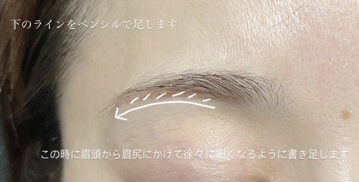 眉頭から眉尻に向かって徐々に細くなるように、ペンシルで足りない部分を描き足していきます。