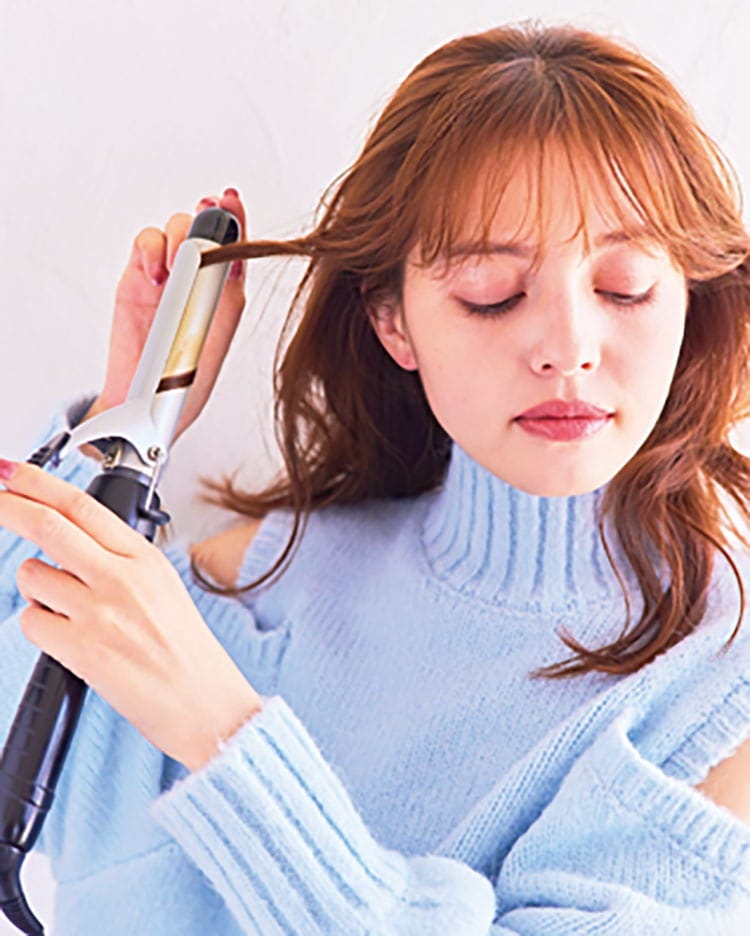 ①前髪をハの字に巻く前髪は軽くセンターパートにして、22㎜のヘアアイロンでハの字のシルエットになるよう先端をゆるく巻く。