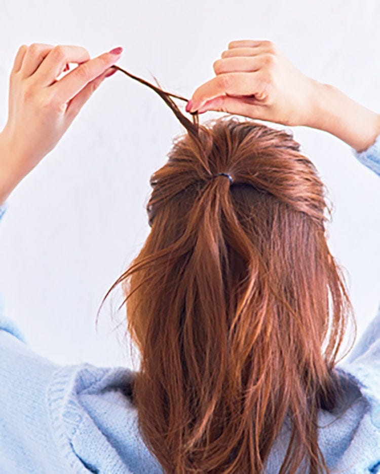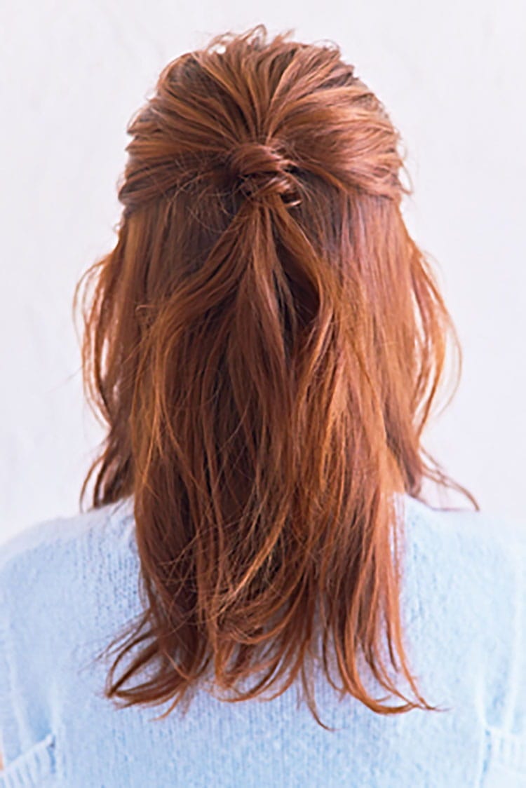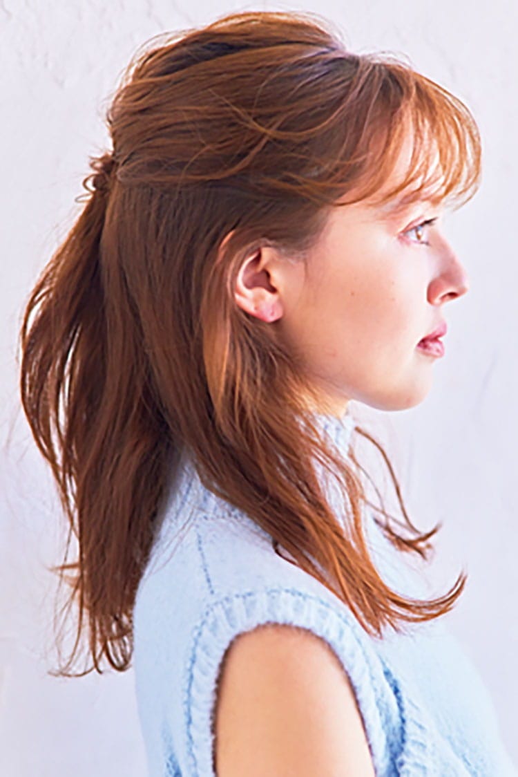 全体もニュアンスをつける程度に巻く。結び目には毛束を巻きつけて。