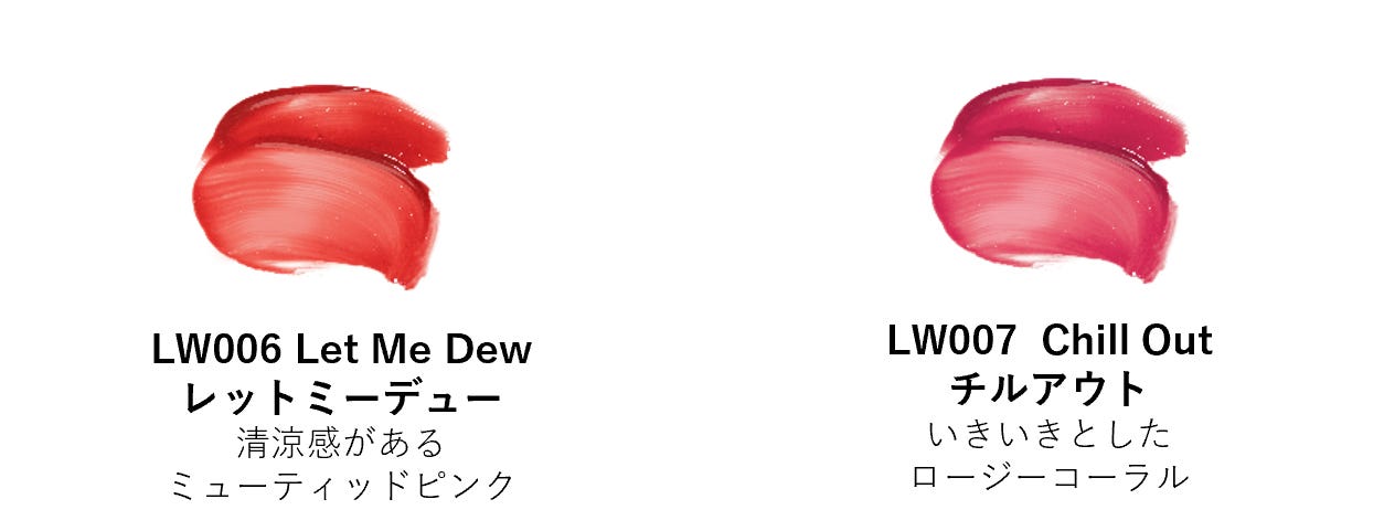 「LW006 Let Me Dew(レットミーデュー)」は、清涼感のあるミューティッドピンク。「LW007 Chill Out(チルアウト)」は、いきいきとしたロージーコーラル