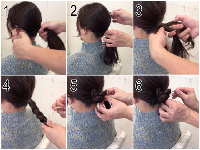 ③④ 毛先を三つ編みしゴム留めします。