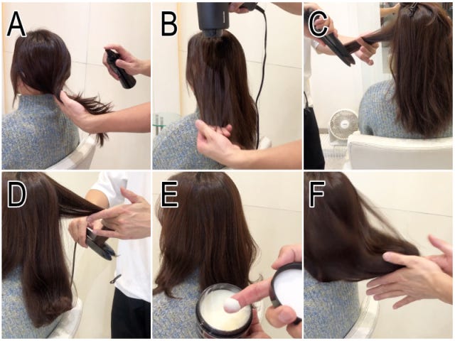 E・F:バーム系(保湿系)のスタイリング剤を毛先に馴染ませます。