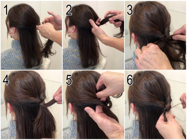 ⑤⑥ 根元に丸め、ピン留めします。