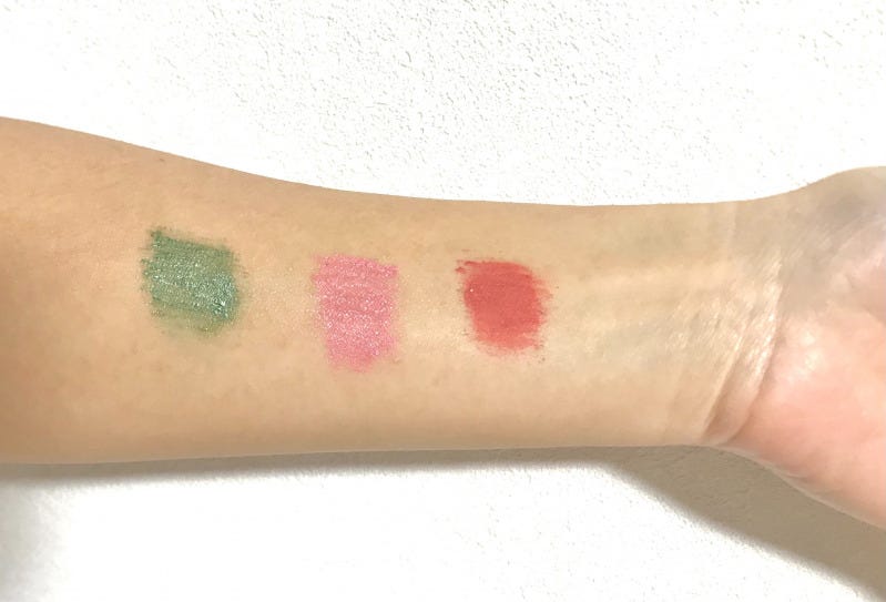 右から、ブライトコーラル、ペタルピンク、フォレストグリーンです。