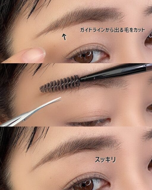 眉頭の毛は長めが旬なのでカットし過ぎず長めに残して眉尻の方の余分な毛をカットすると、眉マスカラを使って毛流れを際立たせる今っぽなアイブロウメイクもしやすくなります。