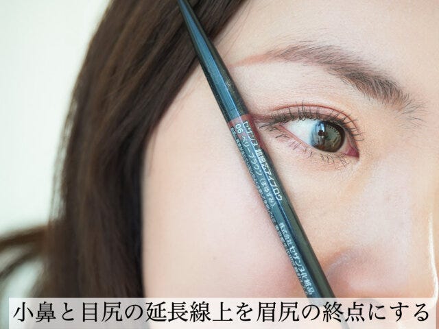 ポイントは、眉尻の終点を決めること。小鼻と目尻を結んだ延長線上を眉尻の終点とします。そして、この終点を目掛けて、眉山から下ろすように描けばOKです。昔流行った細眉のように、鋭角にしすぎないように注意しましょう。