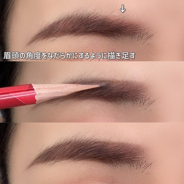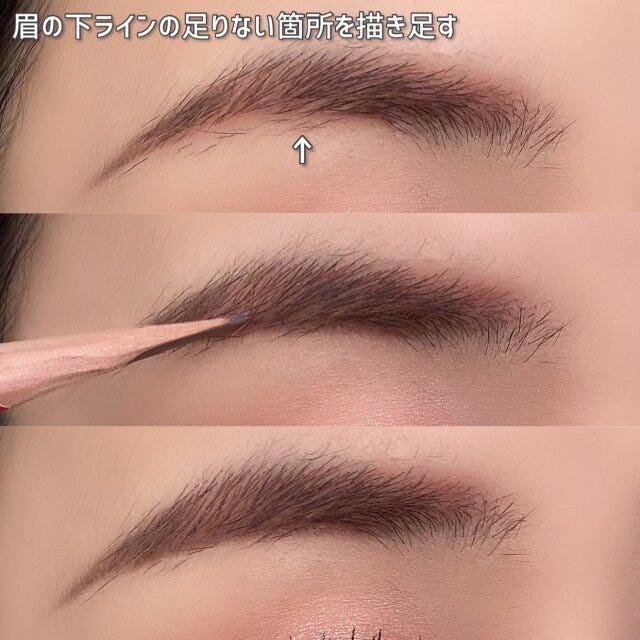 眉頭・眉中央から眉尻へ繋がるように描く時、眉の下のラインにえぐれた箇所があればそこをメインに埋めるようにペンシルで描き足します。