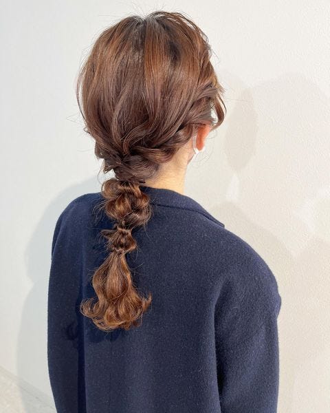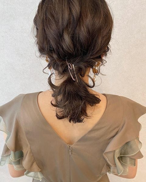 まだ短めの毛束があるミディアムさんなら、しっかりとスタイリング剤をつけて巻き髪をしてから、人気のローポニーテールにするのはいかがでしょうか?