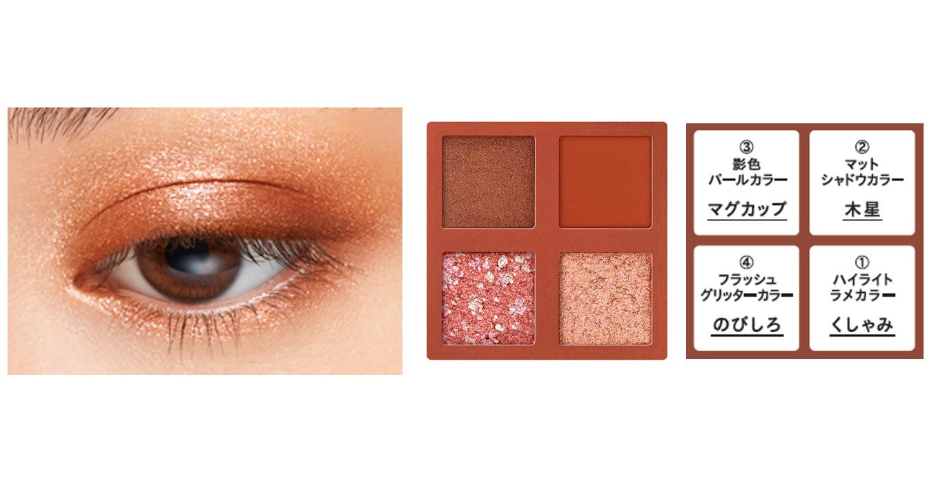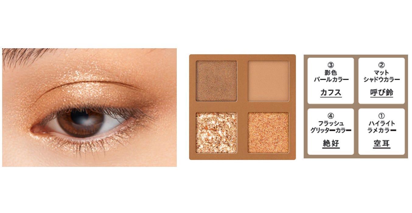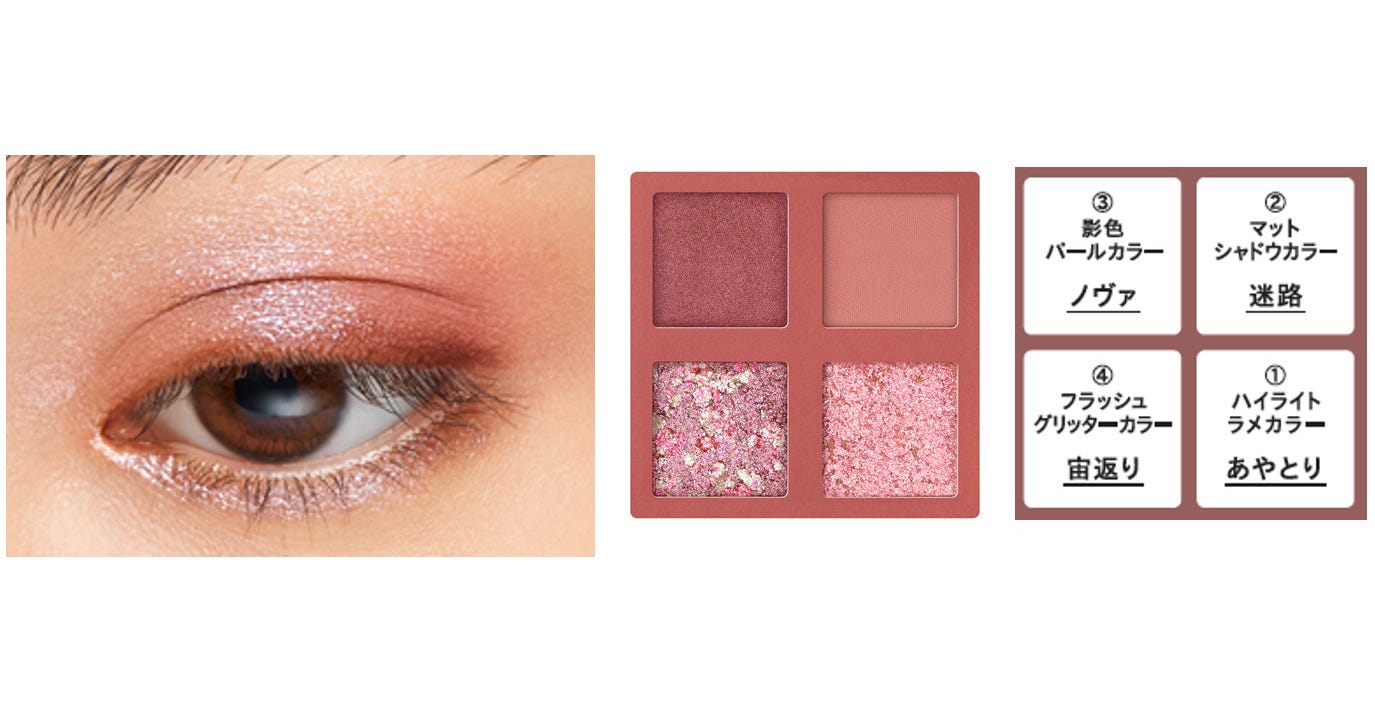 1つのパレットの中に、マット・パール・ラメ・グリッターと質感の異なる4色のアイシャドウが入っていて、4種の質感を重ね合わせることで溶け込むような極上グラデが叶い、大きな瞳の仕上がりに。パレットの左下にある”フラッシュグリッターカラー”は、まばゆくようなさまざまな輝きがつまったカラーで、まぶたの上や、涙袋など、塗り方次第で異なった印象を楽しむことができる。