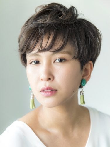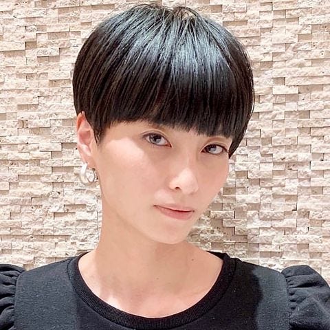 眉上で揃えたパッツン前髪がキュートなベリーショートも、女性らしさを感じさせます。パーマはかけずにナチュラルな髪質をそのまま生かした髪型です。