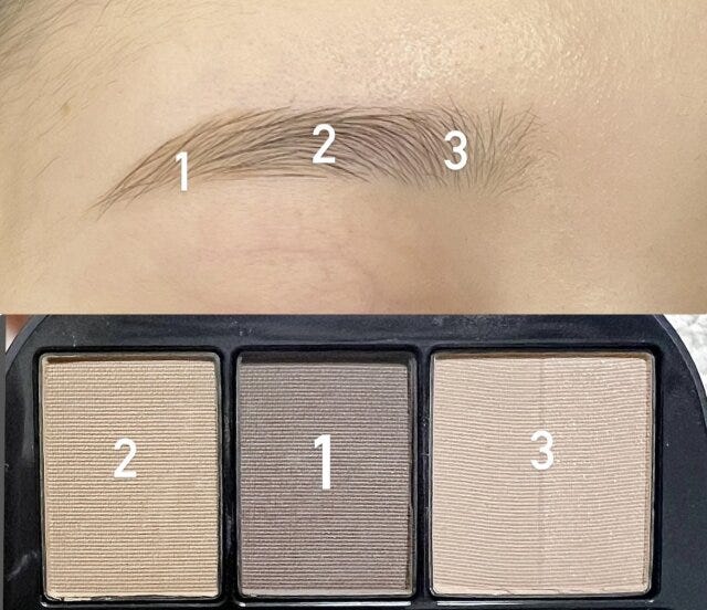 1を眉尻側に、2を中間に、3を眉頭側にのせて境目をスクリューブラシで馴染ませます。