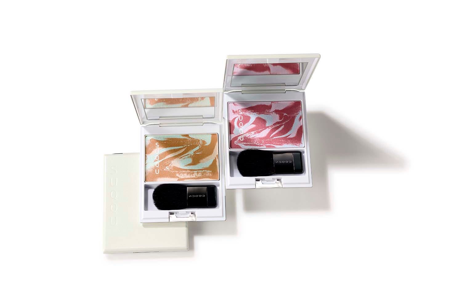 マットで高純度な発色のチークと、透明感をもたらす艶感のハイライトカラーを、マーブル模様に仕立てた逸品。宝石のように多面的な輝きを放つパレットから、異なる3色をブレンドさせることで、透明感のあるほのかな発色に。滲み出るような血色と冴え渡る艶が顔立ちを際立たせる。