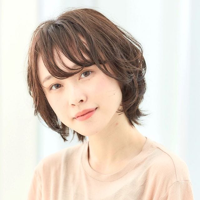 前髪を長めに残すことで、毛先にかけたワンカールのコスメパーマの揺れが強調される髪型です。