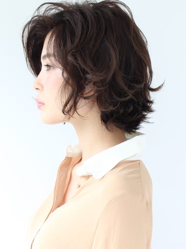 毛先にしっかり動きを出すために、ムースやワックスなどのスタイリング剤を揉みこむとよいでしょう。黒髪に近いダークなブラウンカラーも効いています。