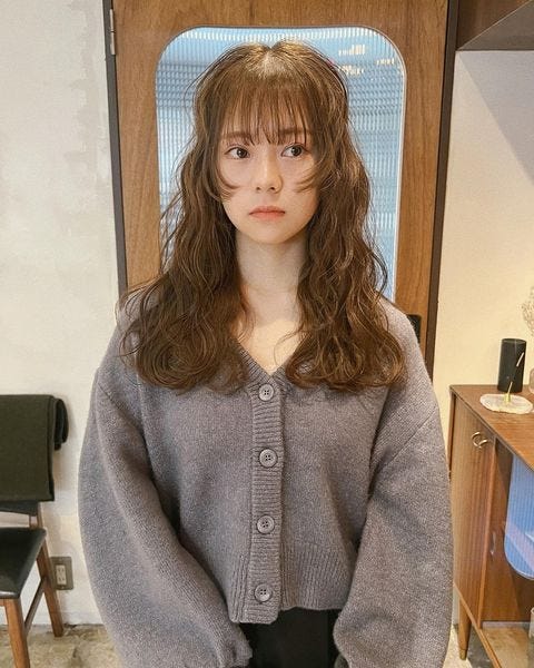 長めの前髪と、顔まわりにレイヤーを入れたロングパーマとの個性が光る組み合わせです。