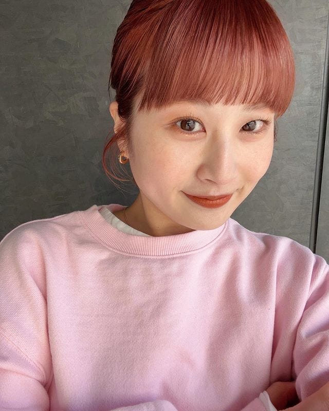 こちらは暖色系の髪色にしたワイドデザインの前髪です。眉のラインでぱっつんと切り揃えた前髪が、大人可愛い雰囲気を盛り上げてくれるでしょう。