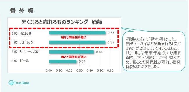 株式会社True Dataが発表した「暑くなると売れるものランキング」は、同社の流通気象コンサルタント(気象予報士) 常盤勝美氏が監修したもの。購買と気象のデータを用いて相関係数を算出し、関係性の強さをランキング形式にまとめています。