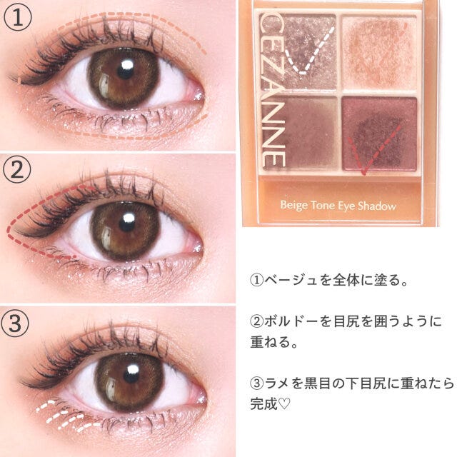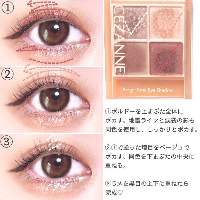 ② ①で塗った境目をベージュでボカす。同色を下まぶたの中央に重ねる。