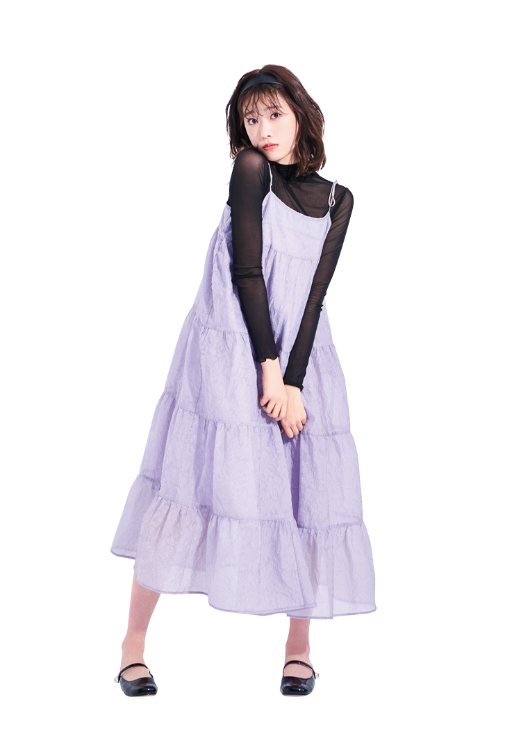 透け感のある黒トップスにはふわふわ軽やかなワンピをあわせて♡ パープルで上品な印象をメイク。