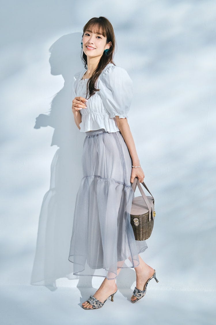 どんなシーンでも使える清楚コーデ。上品さを保ったまま、カゴバッグやミュールで夏ムードも高めて。全体のふんわりとした、軽やかなシルエットがやわらかい印象も演出してくれる♡ 女子会にもデートにも着ていきたい定番モテコーデの完成!