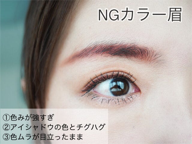 カラー眉がもっとも浮いて見えやすい原因がこちらです。眉のもっとも近くにあるまぶたの色と相性が悪ければ、チグハグな印象が強まってしまいます。