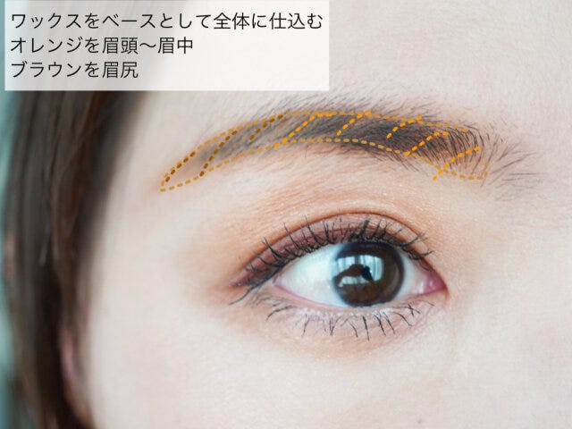 最初に左のワックスを眉全体にベースとして仕込み、次に右のオレンジを眉頭から眉中に、最後に中央のブラウンを眉尻に使いました。ここまで塗ってみて色ムラが気にならない場合は、この時点で眉メイクを終えてもOKです。