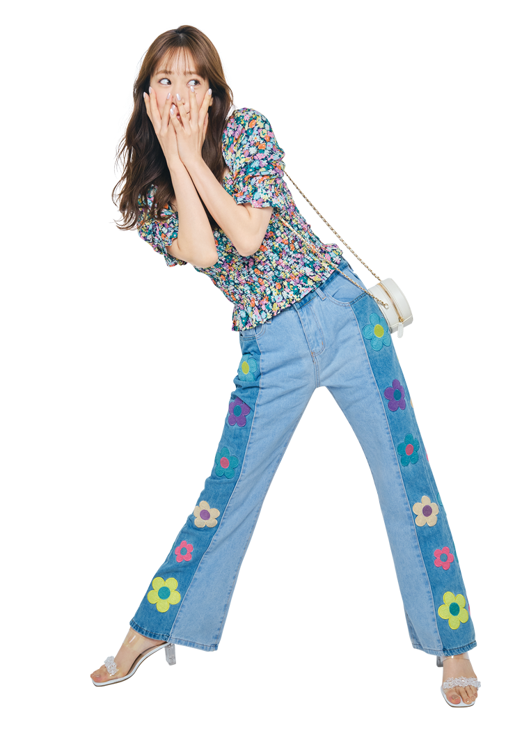 箱推しアピールできるだけでなくカラフルでだれよりも目立てる♡ センターにアクセントが入ったデニムで細見え効果も◎。