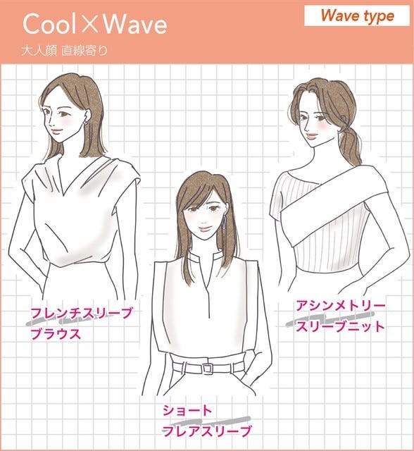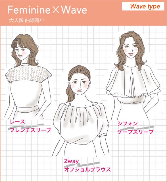 ・レースフレンチスリーブ:今季はデコルテが透け素材のアイテムがトレンド。ウェーブさんならレース素材のフレンチスリーブが女性らしさをアップしてくれておすすめ。