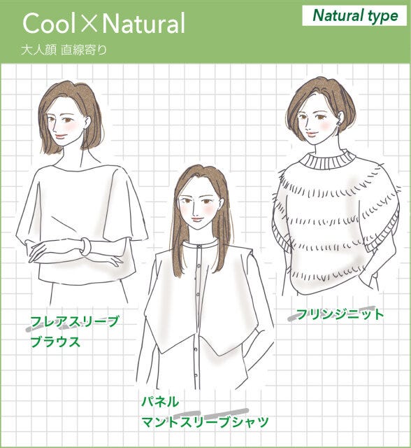 ・フレアスリーブブラウス:袖丈が長めのフレアスリーブは重心が下がるのでナチュラルさんにおすすめ。すっきりした印象がクール。