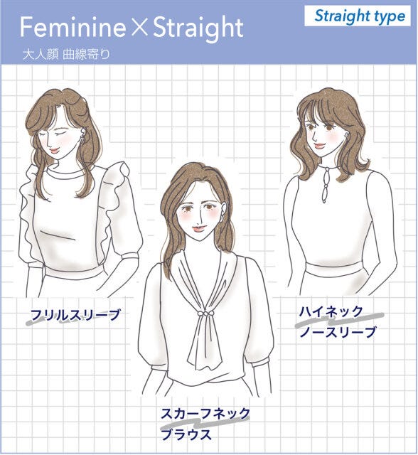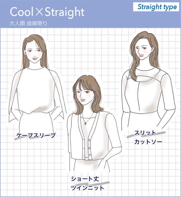 ・ハイネックノースリーブ:首が詰まったものが苦手な印象ですが、首の肌が見える丈のハイネックはOK。セットインスリーブで切られたノースリーブはストレートさんの腕をスッキリ見せてくれます。